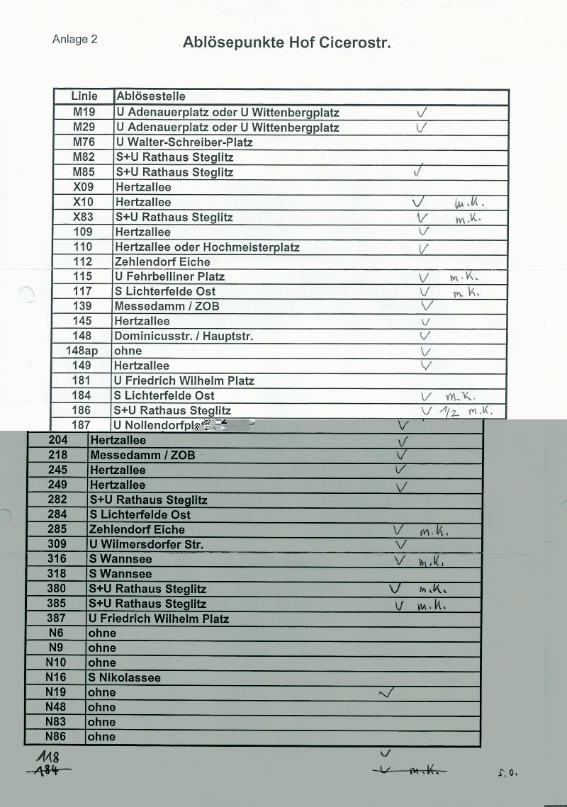 Es gibt aber auf jedem Hof eine Wand, an der alle Infos (Haltestellenverlegung, Endstellenskizze, WC-Nutzung, Umleitungen) zu jeder Linie die von dort bedient wird, hängen. Das man einige Linien häufiger fährt als andere ist natürlich möglich, hängt auch mit der Anzahl der Umläufe und der Pausenregelung (?) zusammen.