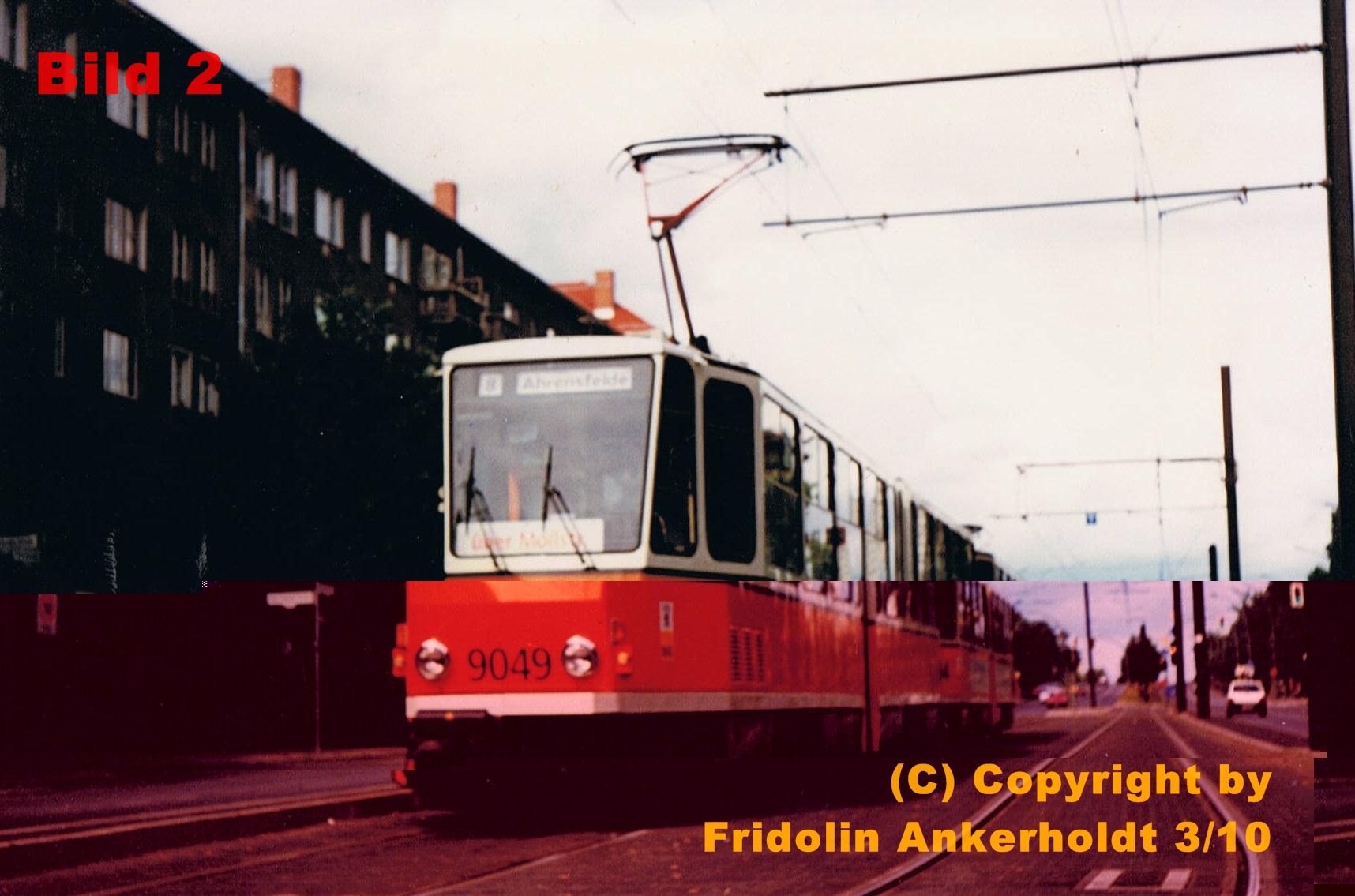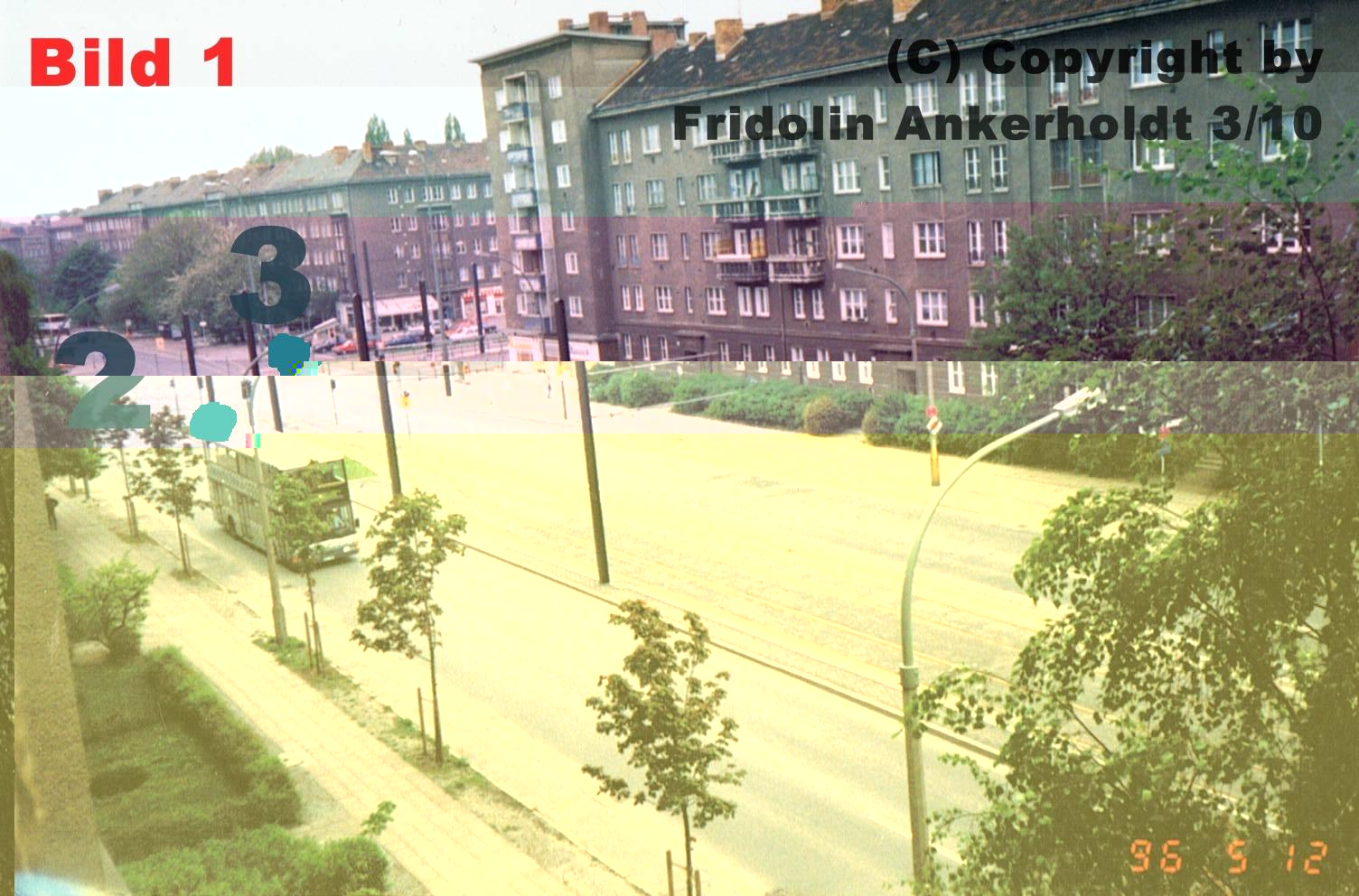 Naja, wie gesagt, auf dem Bild, was von oben geschossen wurde, sieht man 100% kein Gerüst! Und wir wissen, dass die Häuser auf der Danziger erst später saniert wurden (96 noch kein Gerüst) und bis 98 fuhren diese 2 wagen, wie viele andere Tatras in den BVB-farben, nur noch. Das heißt entweder 96, 97 oder 98...98 war der Verkauf (Größtenteils auch schon Abstellung), 96 war im SOmmer kein Gerüst, was man ja dem Bild entnehmen kann - da man auf beiden Bildern Grün sieht, nehme ich an 97!