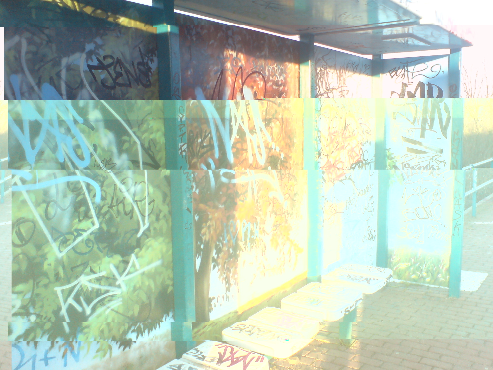 Ich hasse sowas! Bei uns sehen aber manche Haltestellen noch viel schlimmer aus, z.B. Fahrplan mit einem Feuerzeug ''angefakelt'' oder auch geklaut, auf das Haltestellenschild Sachen draufgeschrieben, auf dem Schild große Sticker draufgeklebt, Mülleimer eingetreten, Werbetafeln kaputtgeschlagen und die Plakete entnommen, Bänke mit so'n komischen Klebezeug beschmiert, Lampen im Wartehäuschen geklaut, Farbe abgekrazt uvm.