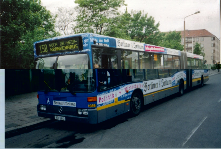 schöne blaue Werbung: Wagen 2641 als 158 an der Haltestelle "Prenzlauer Allee/Ostseestr." im Juni 1996!